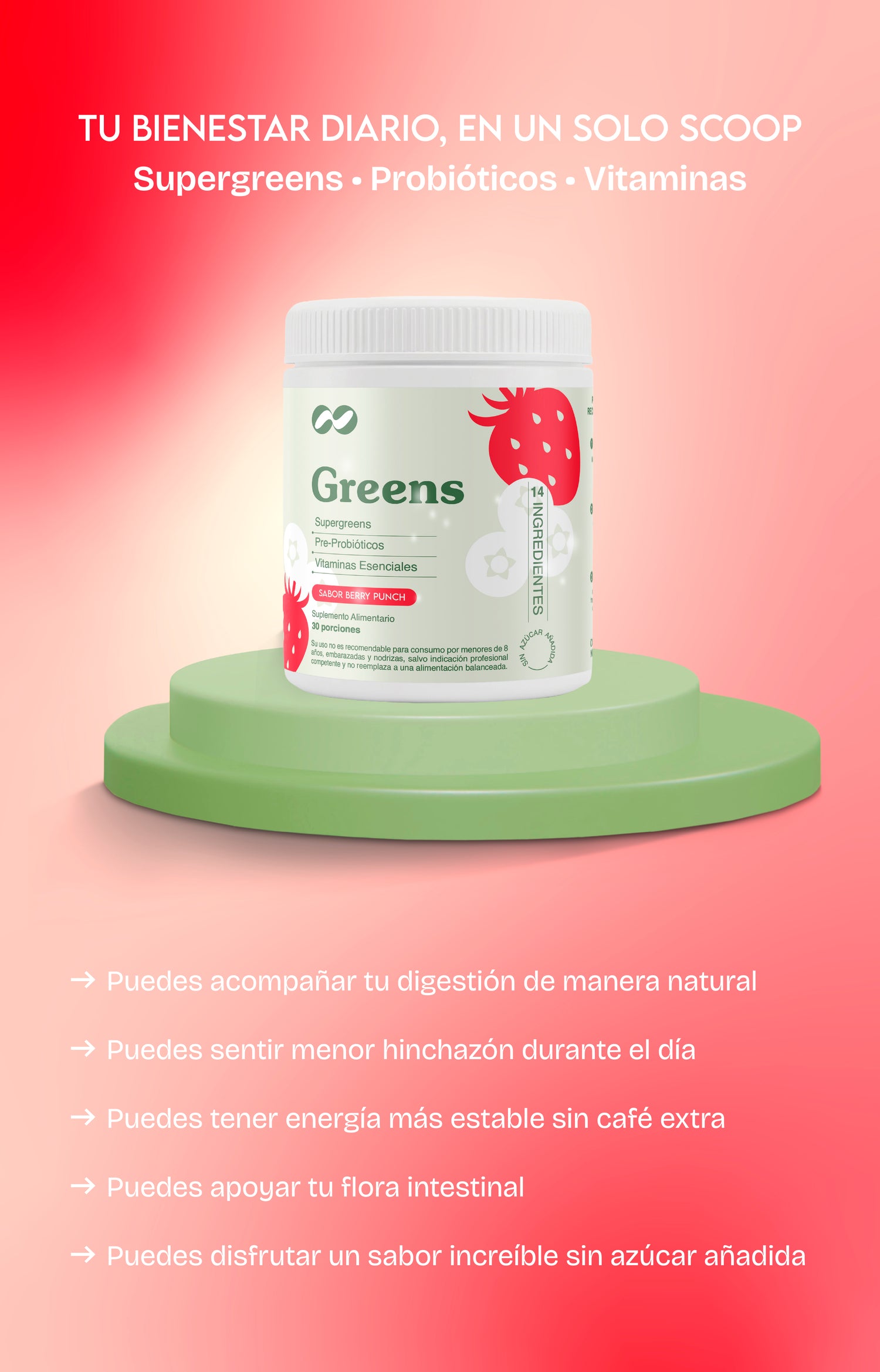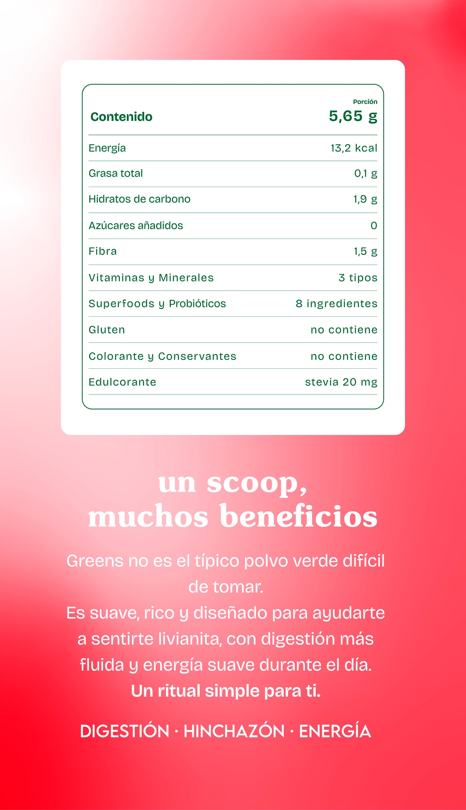 Greens es un mix de superalimentos pensado para acompañar tu digestión y bienestar diario de forma simple. No es una solución mágica ni un detox extremo. Es un hábito fácil de sostener, incluso en un mes caótico como diciembre.
