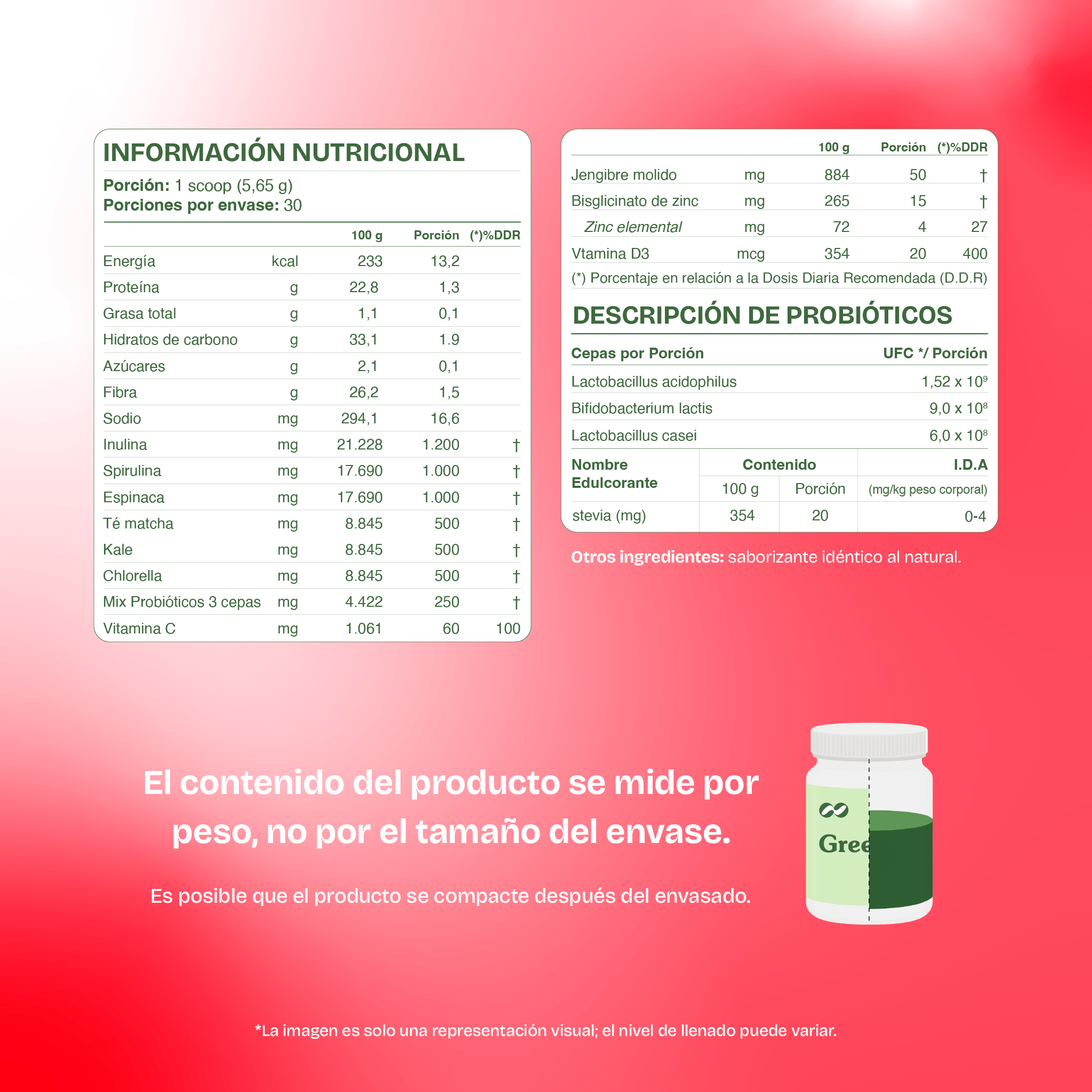 14 ingredientes premium entre supergreens, vitaminas, antioxidantes y cepas probióticas.